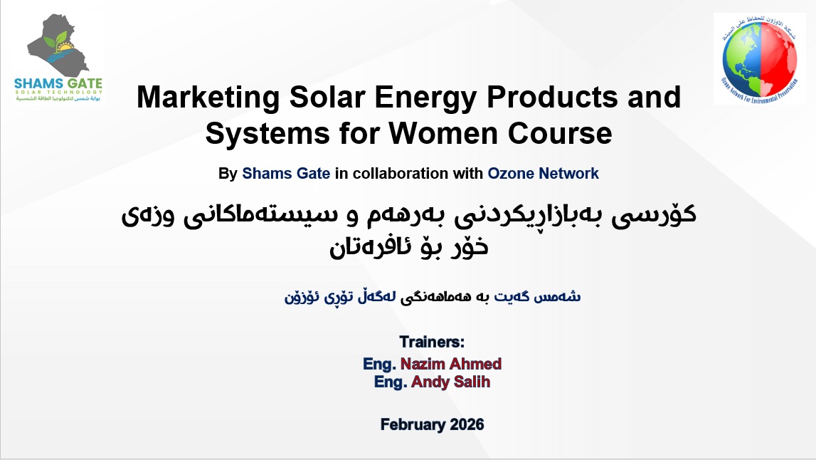 شەمس گەیت خولێکی ٨ ڕۆژە لە شاری هەولێر دەکاتەوە لەسەر بە بازاڕکردنی بەرهەم و سیستەمەکانی وزەی خۆر بە زمانی شیرینی کوردی بۆ ئافرەتان بە هاوکاری و هەماهەنگی لەگەڵ تۆڕی ئۆزۆن ، تۆڕی ئۆزۆن وەک پاڵپشتی بۆ ئافرەتان تاکو لەم بوارە گرنگە رۆڵی کاریگەریان هەبێت و لە پێناو ڕەخساندنی هەڵی کار بۆیان لەم بوارە ، خولەکە لە لایەن ئەندازیارانی ڕاهێنەر بە ئەزموونی نێودەوڵەتی دەگووترێتەوە، بنەما سەرەکییەکانی کارەبا و تەواوی پێکهاتە و جۆرەکانی سیستەمی وزەی خۆر لە خۆ دەگرێت لەگەڵ بنەما گرنگەکانی بازاڕی سۆڵار لە بازاڕێ کوردستان و عێراق و جیاوازی جۆری کار و بەشە پەیوەندارەکانی کۆمپانیاکانی وزەی خۆر و جۆرەکانی بەبازاڕكردن و وەز و جۆرەکانی پڕۆژەی وزەی خۆر و قۆناغەکانی پڕۆسەی فرۆشتن B2B و B2C، لەگەڵ تەکنیک و ڕێگاکانی فرۆشی سەرکەوتوو و دروستکردنی بەها و ئاشنابوون بە سیستەمکانی بەڕێوەبردن و بەدواداچوون و خزمەتگوزاری دوای فرۆشتن تا ئەنجامدانی تاقیکردنەوەی کۆتایی خولەکە و پێدانی بڕوانامە.